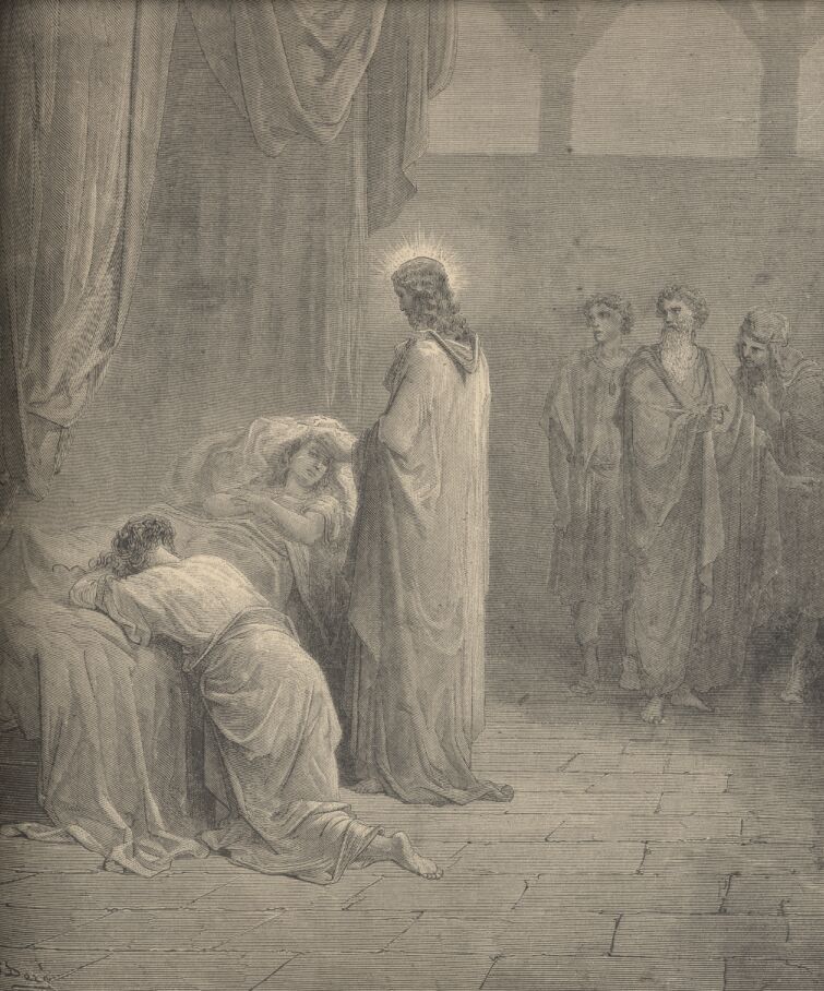 While he yet spake, there came from the ruler of the synagogue's house certain which said, Thy daughter is dead: why troublest thou the Master any further? As soon as Jesus heard the word that was spoken, he saith unto the ruler of the synagogue, Be not afraid, only believe. And he suffered no man to follow him, save Peter, and James, and John the brother of James. And he cometh to the house of the ruler of the synagogue, and seeth the tumult, and them that wept and wailed greatly. And when he was come in, he saith unto them, Why make ye this ado, and weep? the damsel is not dead, but sleepeth. And they laughed him to scorn. But when he had put them all out, he taketh the father and the mother of the damsel, and them that were with him, and entereth in where the damsel was lying. And he took the damsel by the hand, and said unto her, Talitha cumi; which is, being interpreted, Damsel, I say unto thee, arise. And straightway the damsel arose, and walked; for she was of the age of twelve years. And they were astonished with a great astonishment.
