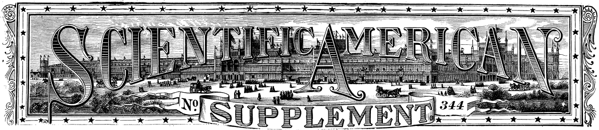 The Project Gutenberg EBook of Scientific American Supplement, No. 344, August 5, 1882, by Various This eBook is for the use of anyone anywhere at no cost and with almost no restrictions whatsoever. You may copy it, give it away or re-use it under the terms of the Project Gutenberg License included with this eBook or online at www.gutenberg.org Title: Scientific American Supplement, No. 344, August 5, 1882 Author: Various Posting Date: October 10, 2012 [EBook #8717] Release Date: August, 2005 First Posted: August 3, 2003 Language: English Character set encoding: ISO-8859-1 *** START OF THIS PROJECT GUTENBERG EBOOK SCIENTIFIC AMERICAN SUPPL., NO. 344 *** Produced by Olaf Voss, Don Kretz, Juliet Sutherland, Charles Franks and the Distributed Proofreaders Team