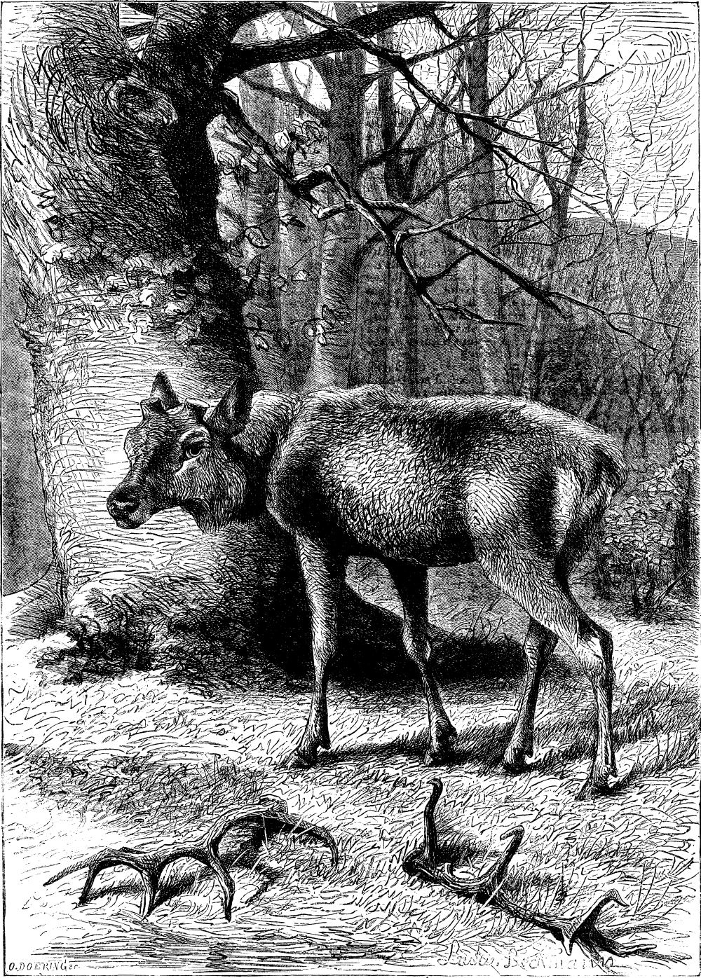 Every year in March the deer loses its antlers, and fresh ones immediately begin to grow, which exceed in size those that have just been lost. Few persons probably have been able to watch and observe the habits of the animal after it has lost its antlers. It will, therefore, be of interest to examine the accompanying drawings, by Mr. L. Beckmann, one of them showing a deer while shedding its antlers, and the other as the animal appears after losing them. In the first illustration the animal has just lost one of its antlers, and fright and pain cause it to throw its head upward and become disturbed and uneasy. The remaining antler draws down one side of the head and is very inconvenient for the animal. The remaining antler becomes soon detached from its base, and the deer turns--as if ashamed of having lost its ornament and weapon--lowers its head, and sorrowfully moves to the adjoining thicket, where it hides. A friend once observed a deer losing its antlers, but the circumstances were somewhat different. The animal was jumping over a ditch, and as soon as it touched the further bank it jumped high in the air, arched its back, bent its head to one side in the manner of an animal that has been wounded, and then sadly approached the nearest thicket, in the same manner as the artist has represented in the accompanying picture. Both antlers dropped off and fell into the ditch.
