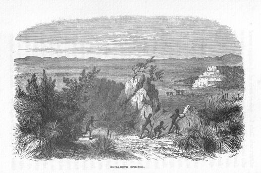 Friday, 18th June, The Elizabeth. We must rest our horses to-day, they have not yet recovered from their long thirst. I am quite disappointed with this creek and the surrounding country. The water is not permanent, it is only rain water; since we arrived yesterday it has shrunk a great deal. There are small plains on each side from a quarter to half a mile broad with salt bush; the hills are very stony with a little salt bush, and destitute of timber, except the few gum-trees in the creek and the mulga bushes in the sand hills.