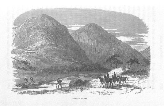 Tuesday, 15th June, Sand Hills. Started at break of day for Pernatta. About 10 a.m. met Mr. Babbage's two men returning with some of the horses for rations. They informed me that the water was nearly all gone, but that there was plenty in the Elizabeth, nineteen miles from Pernatta. I intended to keep on the track, but our black insisted that Pernatta lay through a gap, and not round the bluff. I allowed him to have his own way. Our route was through a very stony saddle. When there we saw a gum creek, and made for it; when we arrived at the creek he told us that was Pernatta. We looked for water, and found a little hole, which, to our great disappointment, contained salt water. Could see nothing of Mr. Babbage's camp. I then asked our black where there was another water; he said, "Down the creek," which we followed. He took us to five or six water holes, with native names, every one dry. The last one he called Yolticourie. It being now within an hour of sundown, I would follow him no longer, but unsaddled, and told Mr. Forster to take the black and the horses, and to steer for the bluff; if he found no water between, to intersect Mr. Babbage's tracks, and follow them up and get water. I remained with our provisions. The black fellow evidently does not know the country. I am sorry that I have taken him with me. I think I shall send him back; he is of little use in assisting to get the horses in the morning.