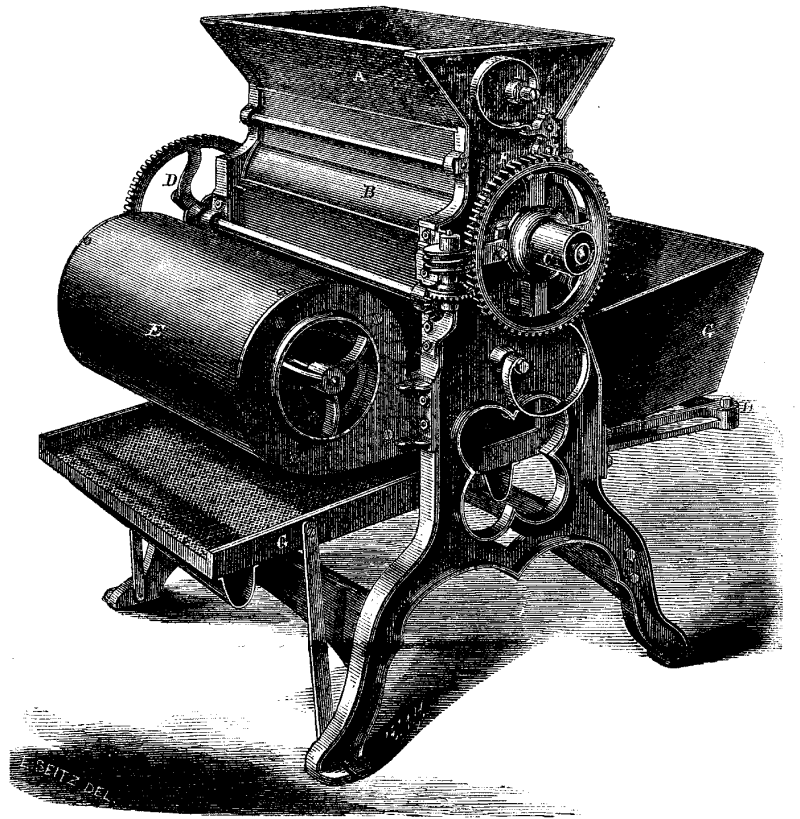 Many of our readers well remember when "hulled corn" was a standing winter dish. This was corn or maize the kernels of which were denuded of their "hulls" by the chemical action of alkalies, which, however, impaired the sweetness of the food. Hominy is corn deprived of the hulls by mechanical means leaving the corn with all its original flavor unimpaired. Hominy is a favorite dish throughout the country, but is not always entirely free from particles of the outer skin of the kernels. The mill shown in perspective in the engraving is intended to obviate this objection.