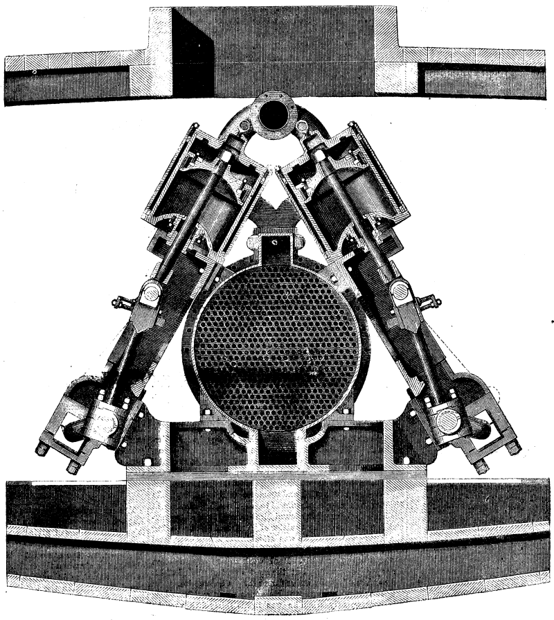It has frequently been urged as an objection against the twin screw system that the double set of engines, four steam cylinders with duplicates of all the working parts called for on this system, render the whole too complicated and heavy for small vessels, preventing, at the same time, the application of surface condensation. In the engines of the Spanish gunboats, of which we annex an illustration from Engineering, the designer, Captain Ericsson, has overcome these objections by introducing a surface condenser, which, while it performs the function of condensing the steam to be returned to the boiler in the form of fresh water, serves as the principal support of the engines, dispensing entirely with the usual framework. Besides this expedient, each pair of cylinders have their slide frames for guiding the movements of the piston rods cast in one piece. Altogether the combination, is such that the total weight and space occupied by these novel twin screw engines do not exceed the ordinary single screw engines of equal power. Several improvements connected with the working gear have been introduced.