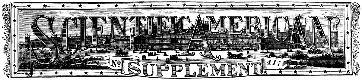 Project Gutenberg's Scientific American Supplement, No. 417, by Various This eBook is for the use of anyone anywhere at no cost and with almost no restrictions whatsoever. You may copy it, give it away or re-use it under the terms of the Project Gutenberg License included with this eBook or online at www.gutenberg.org Title: Scientific American Supplement, No. 417 Author: Various Posting Date: October 10, 2012 [EBook #9163] Release Date: October, 2005 First Posted: September 10, 2003 Language: English Character set encoding: ISO-8859-1 *** START OF THIS PROJECT GUTENBERG EBOOK SCIENTIFIC AMERICAN SUPPL., NO. 417 *** Produced by J. Paolucci, D. Kretz, J. Sutherland, and Distributed Proofreaders