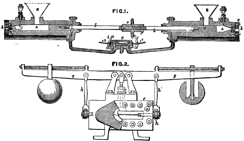 One of the hinderances to the production of a regular and steady light in electric illumination is the absence of perfect uniformity in the carbons. This defect has more than once been pointed out by us, and we are glad to notice any attempt to remedy an admitted evil. To this end we illustrate above a machine for manufacturing carbons, invented by William Cunliffe. The object the inventor has in view is not only the better but the more rapid manufacture of carbons, candles, or electrodes for electric lighting or for the manufacture of rods or blocks of carbon or other compressible substances for other purposes, and his invention consists in automatic machinery whereby a regular and uniform pressure and compression of the carbon is obtained, and the rods or blocks are delivered through the formers, in a state of greater density and better quality then hitherto. The machine consists of two cylinders, A A', placed longitudinally, as shown at Fig. 1, and in reversed position in relation to each other. In each cylinder works a piston or plunger, a, with a connecting rod or rods, b; in the latter case the ends of the rods have right and left handed threads upon which a sleeve, c, with corresponding threads, works. This sleeve, c, is provided with a hand wheel, so that by the turning it the stroke of the plungers, a a, and the size of the chambers, A A', is regulated so that the quantity of material to be passed through the dies or formers is thereby determined and may be indicated. In front of the chambers, A A', are fixed the dies or formers, d d, which may have any number of perforations of the size or shape of the carbon it is intended to mould. The dies are held in position by clamp pieces, e e, secured to the end of the chambers A A', by screws, and on each side of these clamp pieces are guides, with grooves, in which moves a bar with a crosshead, termed the guillotine, and which moves across the openings of the dies, and opening or closing them. Near the front end of the cylinders are placed small pistons or valves, f f, kept down in position by the weighted levers, g g (see Fig. 2, which is drawn to an enlarged scale), which, when the pressure in the chamber exceeds that of the weighted levers connected to the safety valve, f, the latter is raised and the guillotine bar, h, moved across the openings of the dies by the connecting rods, h', thereby allowing the carbon to be forced through the dies. In the backward movement of the piston, a, a fresh supply of material is drawn by atmospheric pressure through the hoppers, B B', alternately. At the end of the stroke the arms of the rocking levers (which are connected by tension rods with the tappet levers) are struck by the disk wheel or regulator, the guillotine is moved back and replaced over the openings of the dies, ready for the next charge, as shown. The plungers are operated by hydraulic, steam, compressed air, or other power, the inlet and outlet of such a pressure being regulated by a valve, an example of which is shown at Fig. 1, and provided with the tappet levers, i i, hinged to the valve chest, C, as shown, and attached to spindles, i' i', operating the slide valves, and struck alternately at the end of each stroke, thus operating the valves and the guillotine connections, i² and i³. The front ends of the cylinders may be placed at an angle for the more convenient delivery of the moulded articles.--Iron.