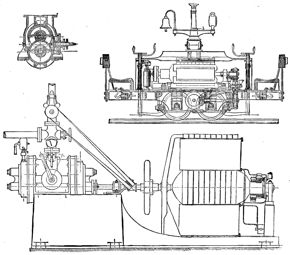 The original electric railway laid down by Messrs. Siemens and Halske at Berlin seems likely to be the parent of many others. One of the most recent is the underground electric line laid down by the firm in the mines of Zankerodain Saxony. An account of this railway has appeared in Glaser's Annalen, together with drawings of the engine, which we are able to reproduce. They are derived from a paper by Herr Fischer, read on the 19th December, 1882, before the Electro-Technical Union of Germany. The line in question is 700 meters long--770 yards--and has two lines of way. It lies 270 meters--300 yards--below the surface of the ground. It is worked by an electric locomotive, hauling ten wagons at a speed of 12 kilometers, or 7½ miles per hour. The total weight drawn is eight tons. The gauge is a narrow one, so that the locomotive can be made of small dimensions. Its total length between the buffer heads is 2.43 meters; its height 1.04 meters; breadth 0.8 meter; diameter of wheels, 0.34 meter. From the rail head to the center of the buffers is a height of 0.675 meter; and the total weight is only 1550 kilogrammes, or say 3,400 lb. We give a longitudinal section through the locomotive. It will be seen that there is a seat at each end for the driver, so that he can always look forwards, whichever way the engine may be running. The arrangements for connection with the electric current are very simple. The current is generated by a dynamo machine fixed outside the mine, and run by a small rotary steam engine, shown in section and elevation, at a speed of 900 revolutions per minute. The current passes through a cable down the shaft to a T-iron fixed to the side of the heading. On this T-iron slide contact pieces which are connected with the electric engine by leading wires. The driver by turning a handle can move his engine backward or forward at will. The whole arrangement has worked extremely well, and it is stated that the locomotive, if so arranged, could easily do double its present work; in other words, could haul 15 to 16 tons of train load at a speed of seven miles an hour. The arrangements for the dynamo machine on the engine, and its connection with the wheels, are much the same as those used in Sir William Siemens' electric railway now working near the Giant's Causeway.--The Engineer.