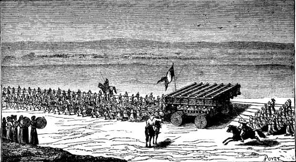 In 1854 Mr. Victor Place moved overland, from Nineveh to Mosul, the winged bulls that at present are in the Assyrian museum of the Louvre, and each of which weighs 32 tons. After carefully packing these in boxes in order to preserve them from shocks, Place laid them upon their side, having turned them over, by means of levers, against a sloping bank of earth That he afterward dug away in such a manner that the operation was performed without accident. He had had constructed an enormous car with axles 0.25 m. in diameter, and solid wheels 0.8 m. in thickness (Fig. 2). Beneath the center of the box containing the bull a trench was dug that ran up to the natural lever of the soil by an incline. This trench had a depth and width such that the car could run under the box while the latter was supported at two of its extremities by the banks. These latter were afterward gradually cut away until the box rested upon the car without shock. Six hundred men then manned the ropes and hauled the car with its load up to the level of the plain. These six hundred men were necessary throughout nearly the entire route over a plain that was but slightly broken and in which the ground presented but little consistency.
