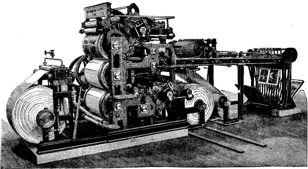 With the invention of the cylinder press by Frederick König was verified the saying that the art of printing had lent wings to words. Everywhere the primitive hand-press had to make way for the steam printing machine; but even this machine, since its advent in London in 1810, has itself undergone so many changes that little else remains of König's invention than the principle of the cylinder. The demands of recent times for still more rapid machines have resulted in the production of presses printing from a continuous roll or "web" of paper, from cylinders revolving in one given direction. The first of this class of presses (the "Bullock" press) was built in America. Then England followed, and there the first newspaper to make use of one was the Times. The Augsburg Machine Works were the first to supply Germany with them, and it was this establishment which first undertook to apply the principle of the web perfecting press (first intended for newspaper work only, where speed rather than fine work is the object sought) to book printing, in which far greater accuracy and excellence is required, and the result has been the construction of a rotary press for the highest grade of illustrated periodical publications, which meets all the requirements with the most complete success.