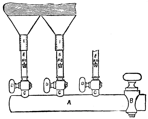 Taking advantage of this system, and combining with it another scientific principle of wide applicability, Mr. J.H. Greathead has brought out an instrument called the "injector hydrant," which seems likely to play an important part in the extinguishing of fires. This second principle is that of the lateral induction of fluids, and may be thus expressed in the words of the late William Froude: "Any surface which in passing through a fluid experiences resistance must in so doing impress on the particles which resist it a force in the line of motion equal to the resistance." If then these particles are themselves part of a fluid, it will result that they will follow the direction of the moving fluid and be partly carried along with it. As applied in the injector hydrant, a small quantity of water derived from the high pressure mains is made to pass from one pipe into another, coming in contact at the same time with a reservoir of water at ordinary pressure. The result is that the water from the reservoir is drawn into the second pipe through a trumpet-shaped nozzle, and may be made to issue as a stream to a considerable height. Thus the small quantity of pressure-water, which, if used by itself, would perhaps rise to a height of 500 feet, is made to carry with it a much larger quantity to a much smaller height, say that of an ordinary house.