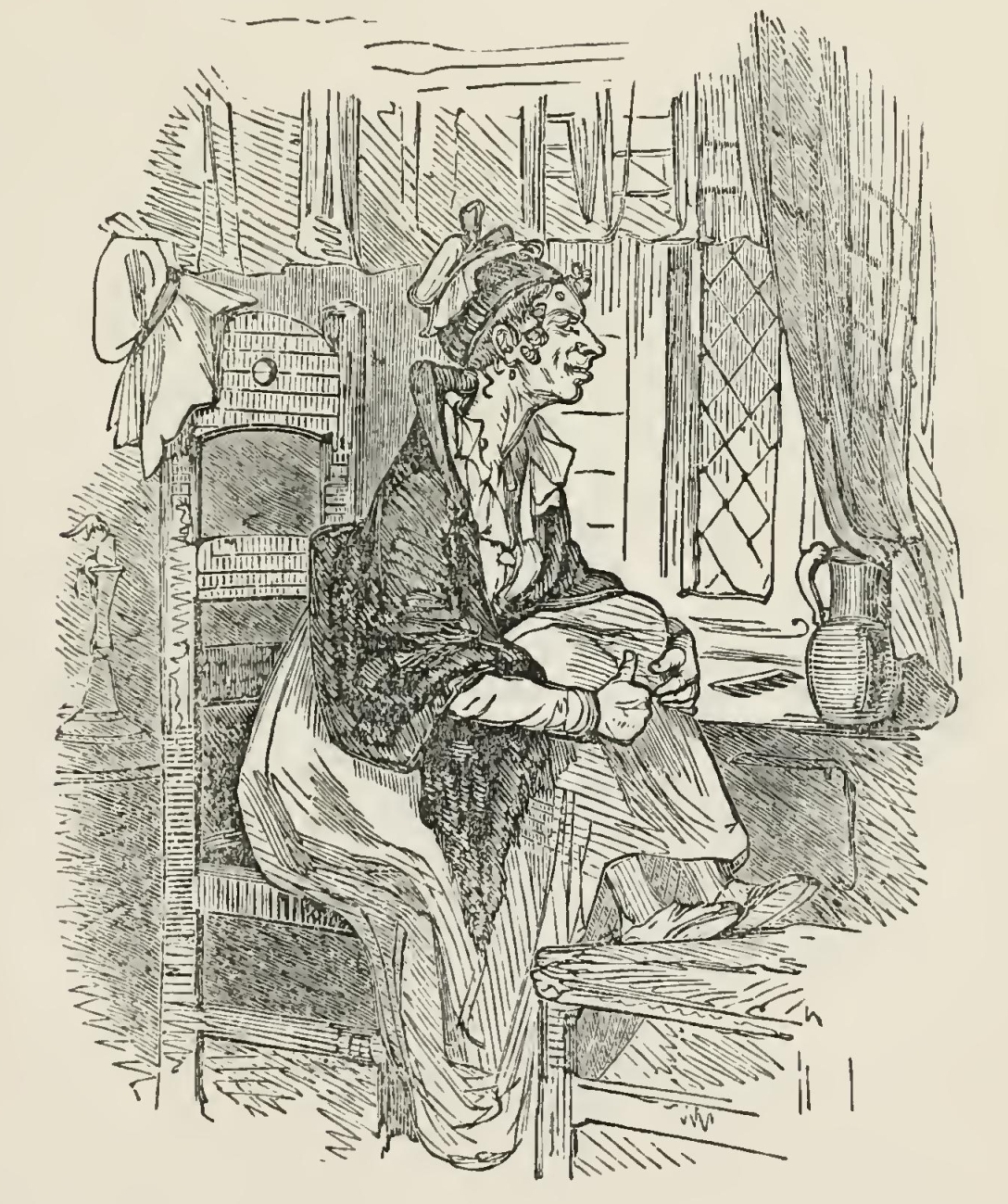 Again John waited leisurely until the observation had thoroughly penetrated to his brain, and then replying, ‘No offence as YET,’ applied a light to his pipe and smoked in placid silence; now and then casting a sidelong look at a man wrapped in a loose riding-coat with huge cuffs ornamented with tarnished silver lace and large metal buttons, who sat apart from the regular frequenters of the house, and wearing a hat flapped over his face, which was still further shaded by the hand on which his forehead rested, looked unsociable enough.