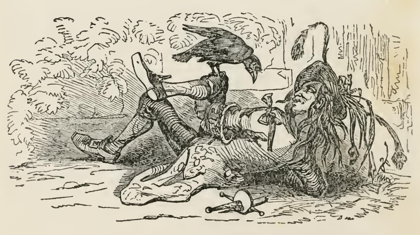 While I was yet inconsolable for his loss, another friend of mine in Yorkshire discovered an older and more gifted raven at a village public-house, which he prevailed upon the landlord to part with for a consideration, and sent up to me. The first act of this Sage, was, to administer to the effects of his predecessor, by disinterring all the cheese and halfpence he had buried in the garden—a work of immense labour and research, to which he devoted all the energies of his mind. When he had achieved this task, he applied himself to the acquisition of stable language, in which he soon became such an adept, that he would perch outside my window and drive imaginary horses with great skill, all day. Perhaps even I never saw him at his best, for his former master sent his duty with him, ‘and if I wished the bird to come out very strong, would I be so good as to show him a drunken man’—which I never did, having (unfortunately) none but sober people at hand.