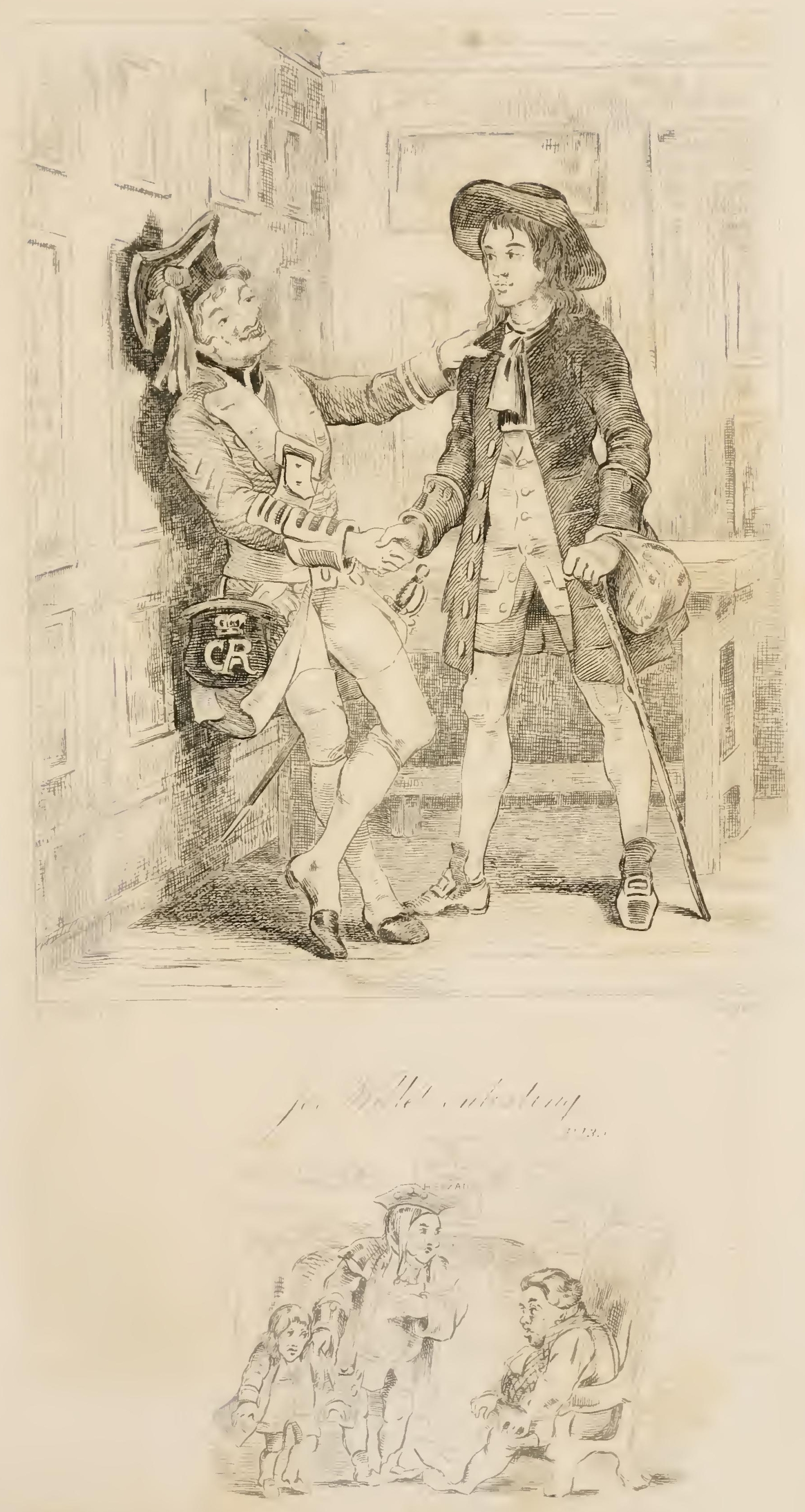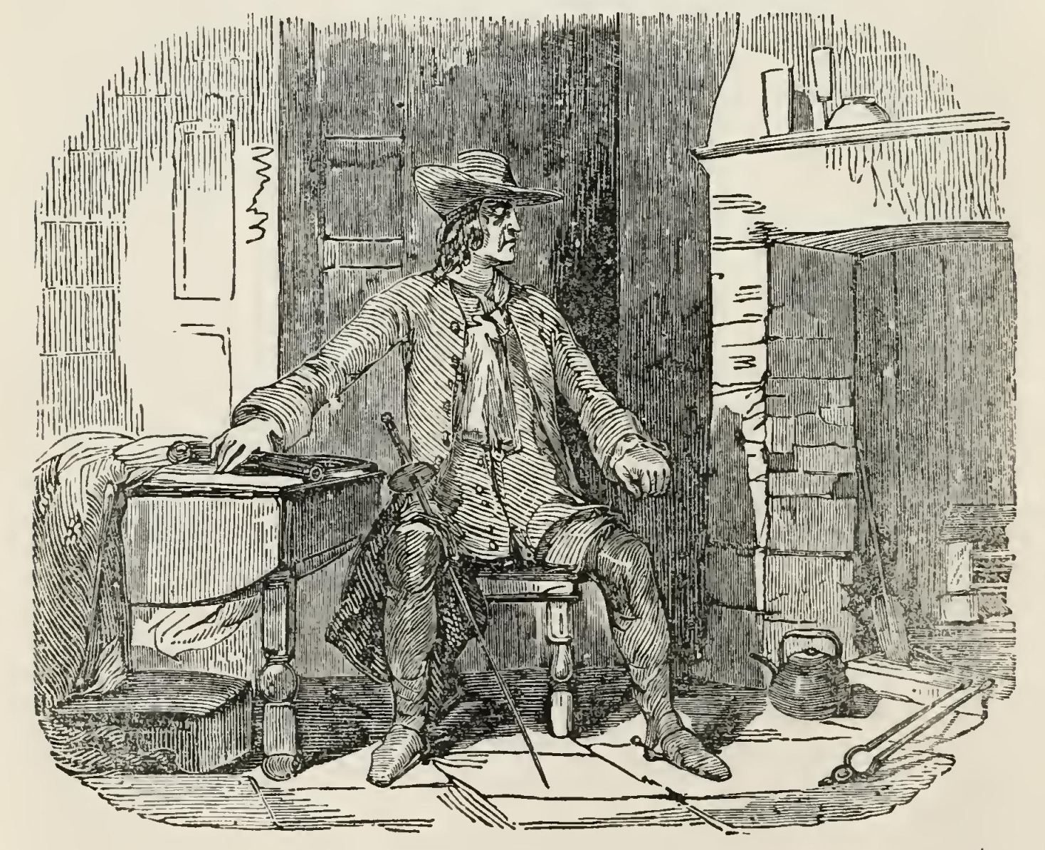 There was another guest, who sat, booted and spurred, at some distance from the fire also, and whose thoughts—to judge from his folded arms and knitted brows, and from the untasted liquor before him—were occupied with other matters than the topics under discussion or the persons who discussed them. This was a young man of about eight-and-twenty, rather above the middle height, and though of somewhat slight figure, gracefully and strongly made. He wore his own dark hair, and was accoutred in a riding dress, which together with his large boots (resembling in shape and fashion those worn by our Life Guardsmen at the present day), showed indisputable traces of the bad condition of the roads. But travel-stained though he was, he was well and even richly attired, and without being overdressed looked a gallant gentleman.