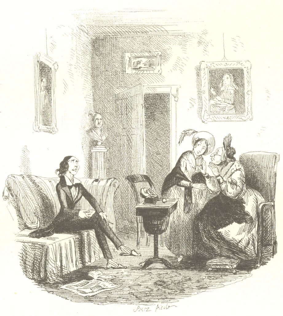 The two chief subjects of Felix’s discourse, are himself and his mother, both of whom would appear to be very wonderful and interesting persons. As Felix and his mother are seldom apart in body, so Felix and his mother are scarcely ever separate in spirit. If you ask Felix how he finds himself to-day, he prefaces his reply with a long and minute bulletin of his mother’s state of health; and the good lady in her turn, edifies her acquaintance with a circumstantial and alarming account, how he sneezed four times and coughed once after being out in the rain the other night, but having his feet promptly put into hot water, and his head into a flannel-something, which we will not describe more particularly than by this delicate allusion, was happily brought round by the next morning, and enabled to go to business as usual.