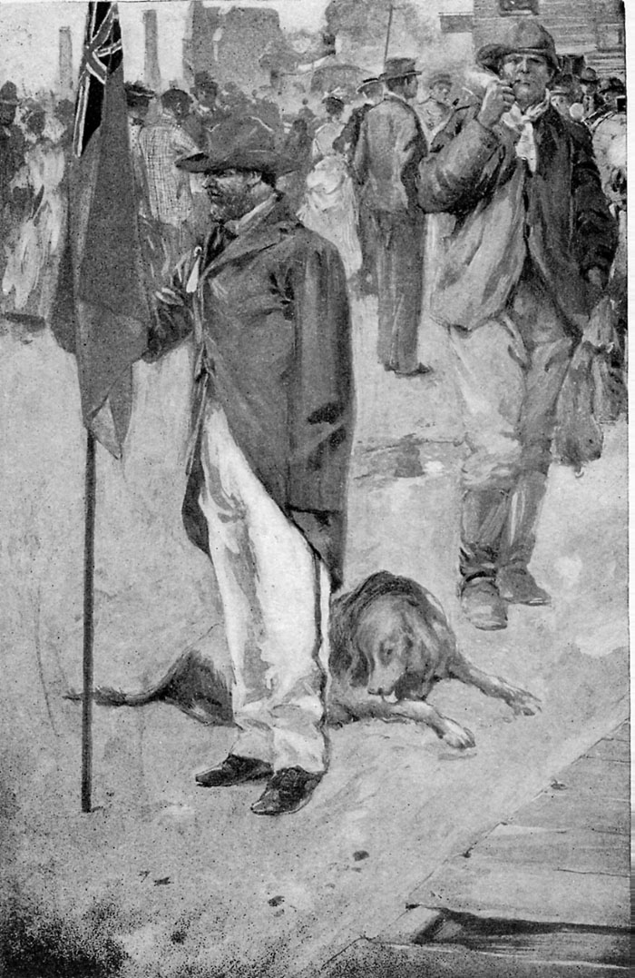 The man was short. He wore a felt hat, so big that it rested on his ears. A gray wool shirt hung below his neck. A cutaway coat miles too large depended below his knees and to the first joints of his fingers. By way of official uniform his legs were incased in an ordinary rough pair of miller's white trousers, on which broad strips of red flannel had been roughly sewn. Everything was wrinkled in the folds of too-bigness. As though to accentuate the note, the man stood very erect, very military, and supported in one hand the staff of an English flag. This figure of fun, this man made from the slop-chest, this caricature of a scarecrow, had been put forth by heavy-handed facetiousness to the post of greatest honour. He was Standard-Bearer to the occasion! Surely subtle irony could go no further.