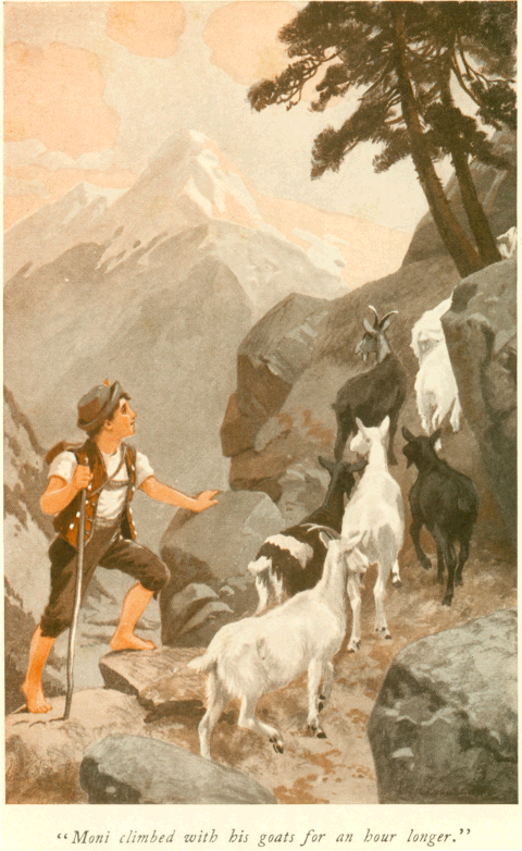In the sky the rosy morning clouds were disappearing and a cool mountain breeze rustled around Moni's ears, as he climbed up. This he thought just right. He yodeled with satisfaction from the first ledge so lustily down into the valley that many of the sleepers in the Bath House below opened their eyes in amazement, then closed them again at once, for they recognized the sound and knew that they could have an hour longer to sleep, since the goat-boy always came so early. Meanwhile Moni climbed with his goats for an hour longer, farther and farther up to the high cliffs above.