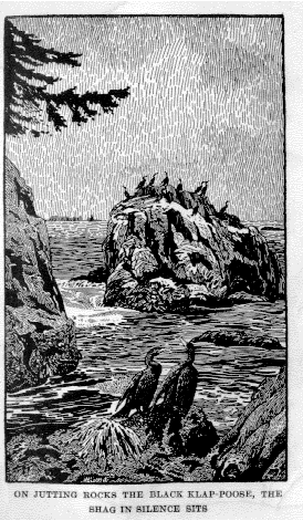 Between the bays are rugged rocky points, where, by the constant wash of winter waves the rocks are carved in shapes uncouth and weird--giants in stone, whose heads are crowned with scrubby conifers, upon whose feet the wild seas break, or in the summer time the gentle wavelets lap. On jutting rocks the black Klap-poose, the shag, in silence sits, while circling overhead the keen eyed gulls watch for the shoals of fry on which they feed.
