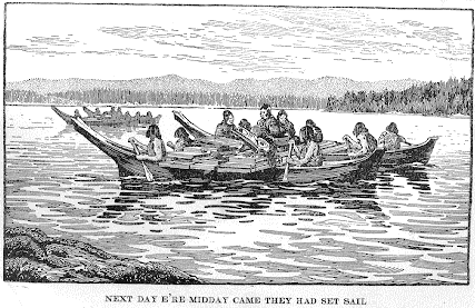 To Lup-se-kup-se they returned next day, and there they saw, among the women in the lodge, the girl who spoke to them, when they had landed on the river bank opposite Ok-sock-tis. Then Ha-houlth-thuk-amik, desiring to convey her home with him, took her aside and said, "If thou wilt come with me, say not a word, but unbeknown make haste and leave the house, and run across the point which forms the eastern bank where this the Tsomass river joins the inland sea, then hide thyself until we take thee in, as we are paddling home."
