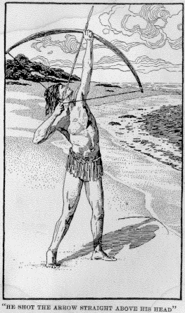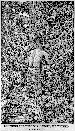 Eut-le-ten started with no arms but his courage, to face the dread witch who had spirited away the children. The trail lay long, unknown and untrodden, save by the timber wolf, panther and black bear. It was feared by the Indians for dangers most dreadful--the greatest of all the chehah E-ish-so-oolth. He broke through dense shalal, fringing the green woods, making the shore line all but impenetrable. Into the thick woods, under the silvery spruce, brushing the hemlock boughs he walked stealthily. Salmon berry thickets impeded his progress, scratched his round limbs with the thorns on their canes. He passed white helebore, so tall and so handsome. He saw how the black bear had fed on swamp lily, tramping the glossy leaves into the black mud. He spurned the devil's club with berries so red and with poisonous thorns on stem and on leaf. Such was the trail as it led him far inland, inland away from his home by the sea. At last by a cool stream, the path lay before him. Hard by the stream a lodge was erected, a house of such size the boy stood dumbfounded, and he knew that this must be the dwelling of the children's dread captor.