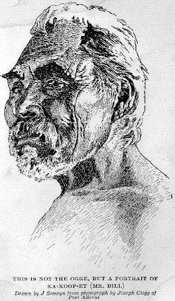In those days we were permitted to attend the potlatches and witness the animal and other dances, among which were the "Panther," "Red Headed Woodpecker," "Wild Swan" and the "Sawbill Duck." Generally we were welcome at the festivals, provided we did not laugh or show sign of any feeling save that of grave interest. Among my Indian acquaintances of those days was Ka-coop-et, better known in the district as Mr. Bill. Bill is a fine type of Seshaht, quite intelligent and with a fund of humour. Having made friends, he told me in a mixture of broken English and Chinook some of the old folk lore of his tribe. Of these stories I have selected for publication "How Shewish Became a Great Whale Hunter" and "The Finding of the Tsomass." This latter story as I present it, is a composite of three versions of the same tale, as received, by Gilbert Malcolm Sproat about the year 1862; by myself from "Bill" in 1896, and by Charles A. Cox, Indian Agent, resident at Alberni, from an old Indian called Ka-kay-un, in September 1921. Ka-kay-un credits his great great grandfather with being the father of the two young Indians who with the slave See-na-ulth discovered the valley now known as Alberni, while "Bill" gave the credit to the sons of "Wick-in-in-ish."