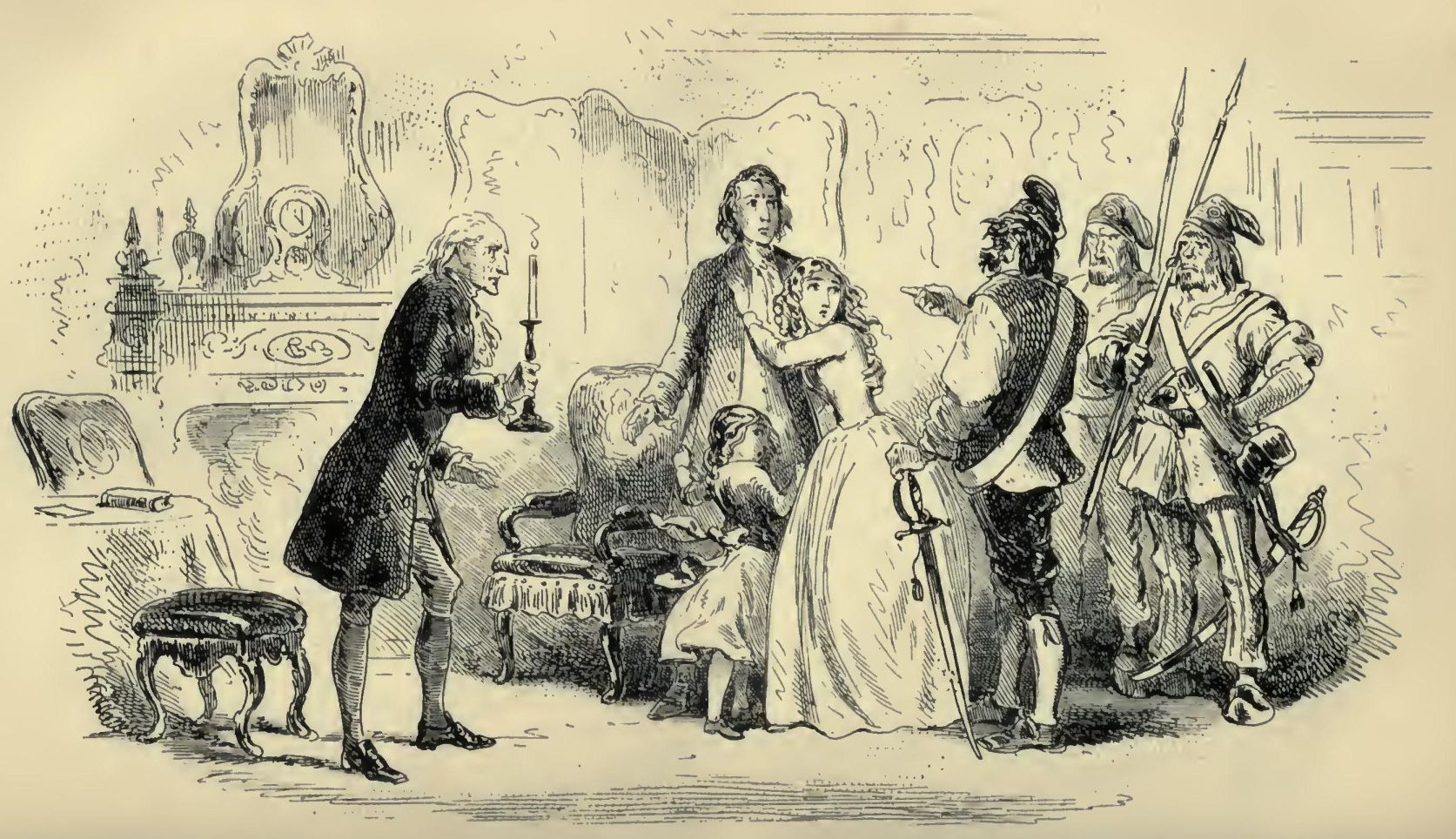 “Woman imbecile and pig-like!” said Madame Defarge, frowning. “I take no answer from you. I demand to see her. Either tell her that I demand to see her, or stand out of the way of the door and let me go to her!” This, with an angry explanatory wave of her right arm.